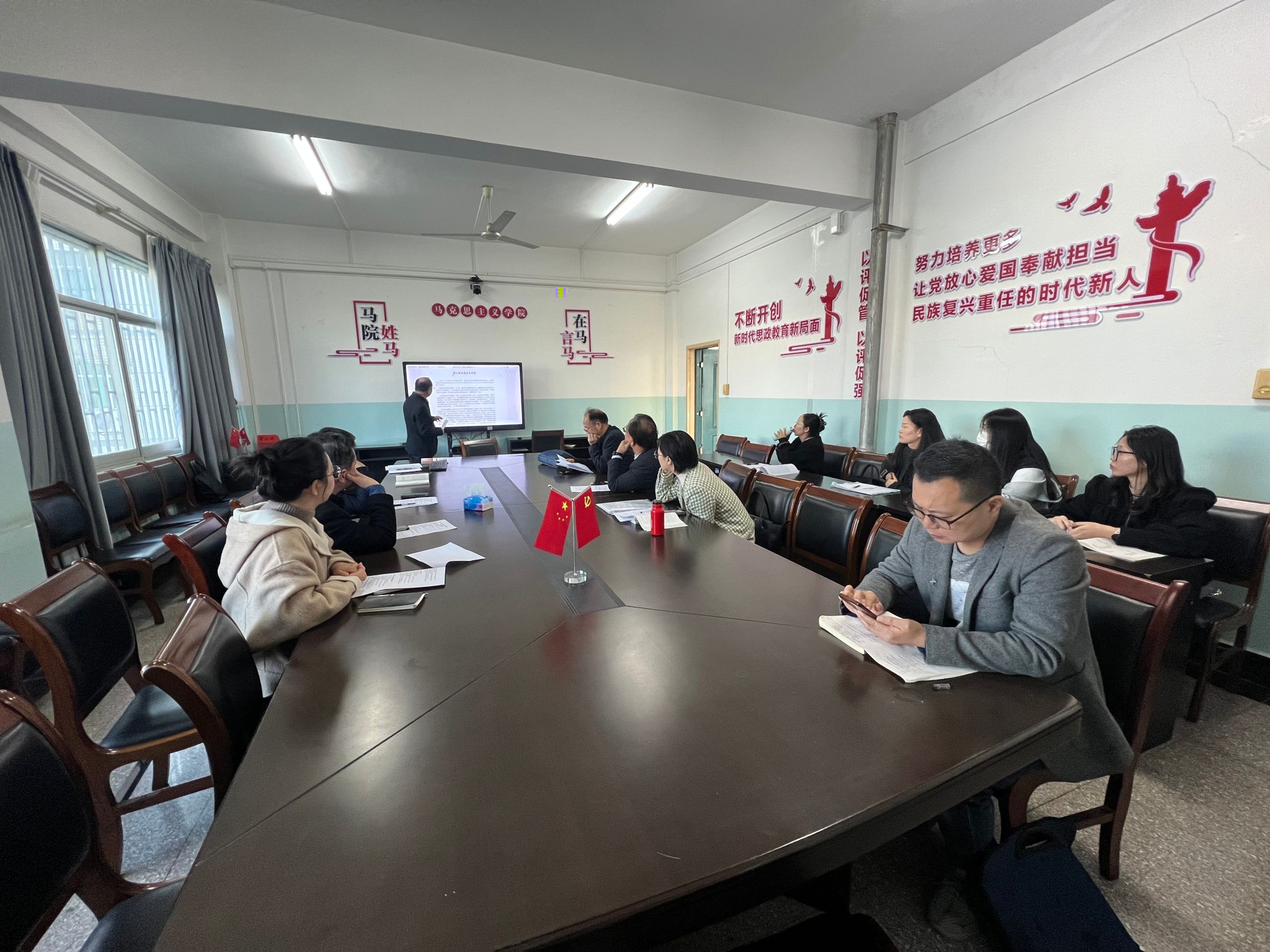 会议首先由两位老师围绕《概论》第三、四章进行备课交流,王恒彦老师从历史纵深和新中国国情出发,深入剖析了“一化三改”的必然性、现实性,指明了社会主义改造的重大意义,强调思政课教学既要有历史穿透力,还要有国家情怀。江文力老师围绕社会主义道路初步探索的理论成果和经验教训进行深入剖析,强调课堂教学要善于抓住重点,深入浅出,用政治理论联系学生学习生活实际,解答学生思想困惑,让学生真信、真学、真懂。