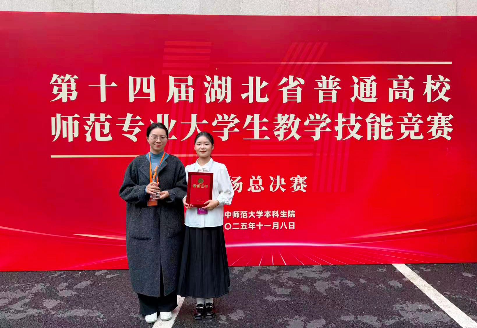 本次竞赛由湖北省教育厅主办、华中师范大学承办,是全省师范类专业的标杆性赛事,吸引了全省16所本科高校227名选手参与19个组别角逐,经初赛遴选后70名优秀选手晋级总决赛。竞赛涵盖教学设计、课件制作、即席演讲、授课四大核心环节,采用现场抽签、限时完成的方式,全面考察参赛选手的教学综合能力。面对来自全省高校的参赛选手,向淑旎同学沉着应战,以严谨的教学设计、生动的课堂呈现和娴熟的教学技巧脱颖而出,赢得评委一致认可。