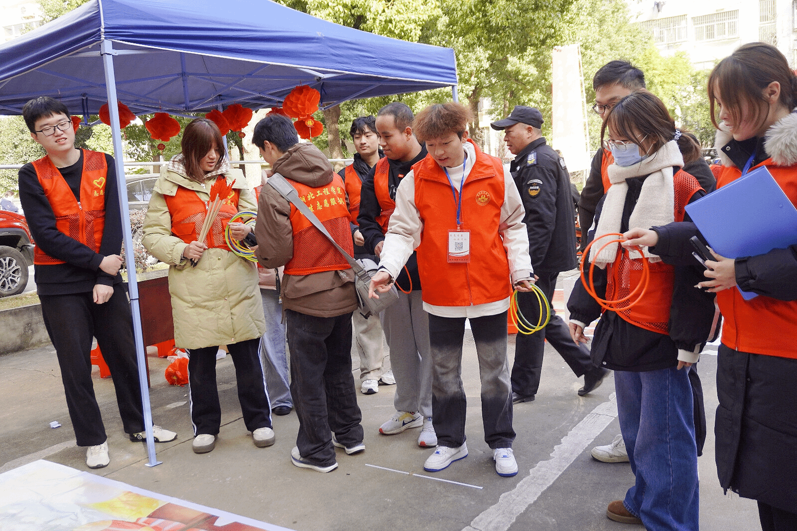 活动当日,志愿者提前抵达现场,有序完成场地规划、设施调试、物资分置等筹备工作,以严谨的组织纪律展现了青年队伍的良好风貌。本次活动聚焦文明传播+民俗体验双主线,设置猜灯谜、套圈、投壶、踢毽子四项互动环节,各区域参与热度持续攀升,现场秩序规范且氛围热烈。