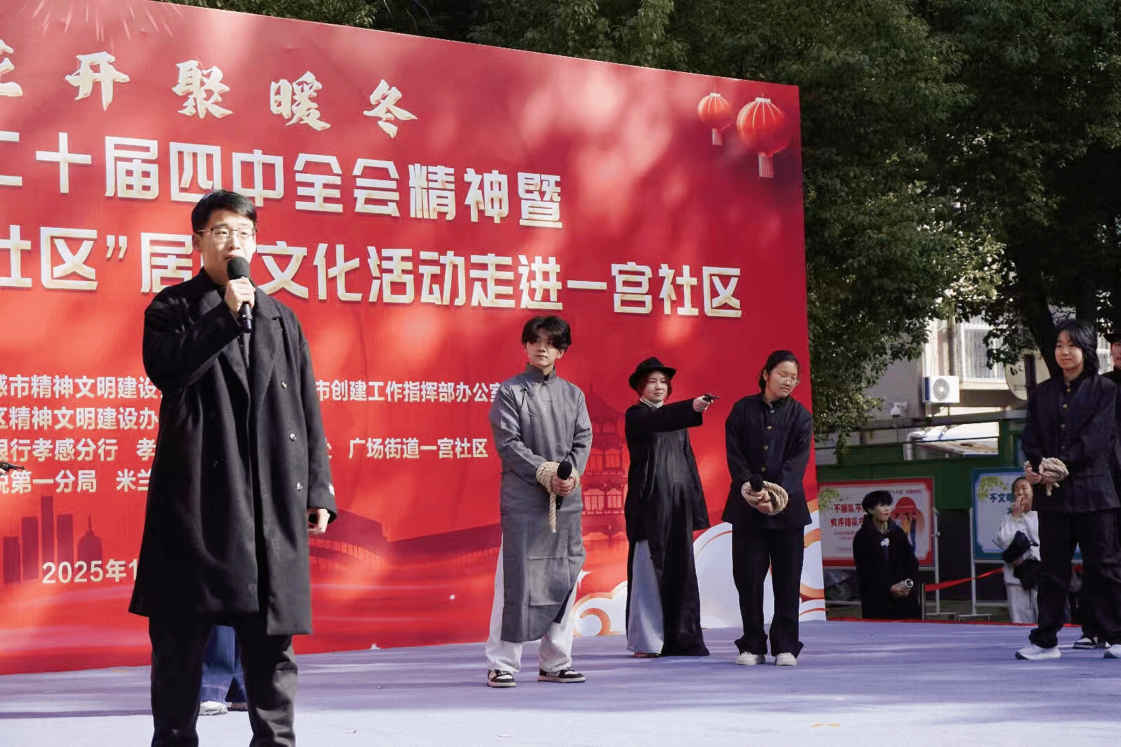 活动现场,红色舞台剧《宣言》以沉浸式表演还原革命先辈坚守信仰的峥嵘岁月,当先辈跨越时空看到如今的幸福生活,更让观众共情初心的重量;随后的郭庄舞则以特色民族服饰、明快节奏,传递出多元文化的活力,为社区冬日添了暖意。两位青年学子献的《江南》,以清澈歌声演绎经典旋律,既展现青春风采,也让居民在熟悉曲调中感受温暖,现场掌声不断。